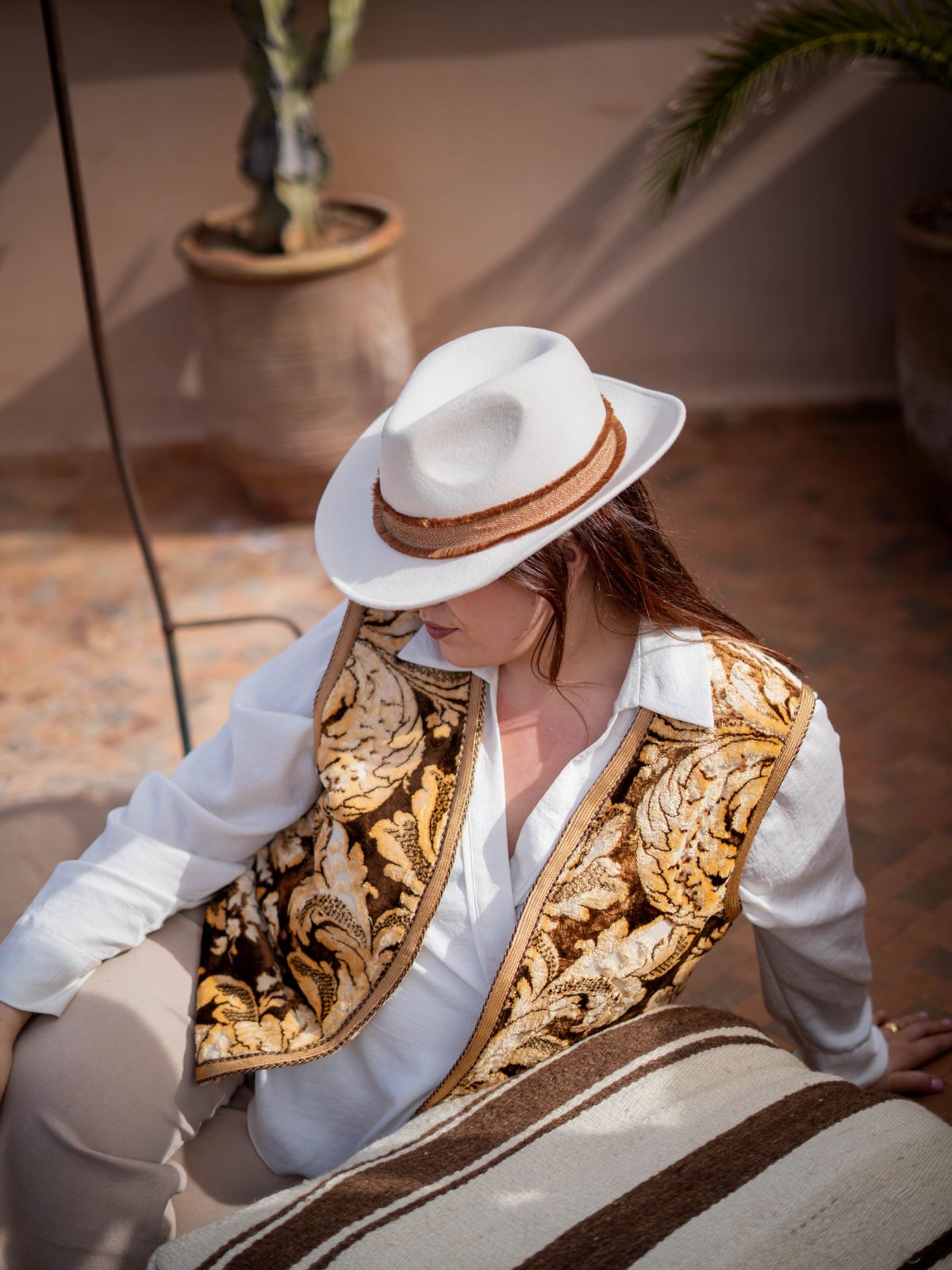 Confectionné à la main avec une grande exigence de qualité, ce gilet se distingue par ses finitions raffinées. Son liseré est réalisé en sfifa, une passementerie textile traditionnelle, tissée avec précision, qui apporte structure et élégance à la silhouette tout en soulignant les lignes du vêtement.