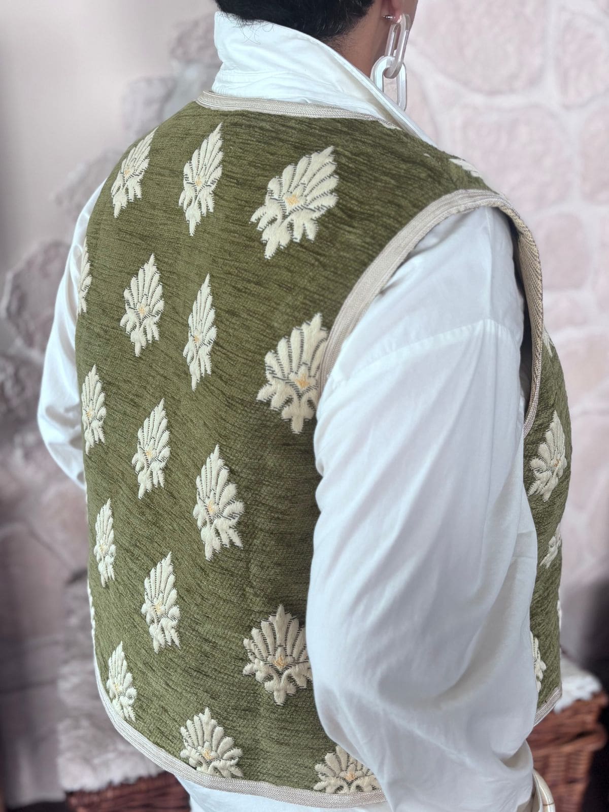 Confectionné à la main avec une grande exigence de qualité, ce gilet se distingue par ses finitions raffinées. Son liseré est réalisé en sfifa, une passementerie textile traditionnelle, tissée avec précision, qui apporte structure et élégance à la silhouette tout en soulignant les lignes du vêtement.