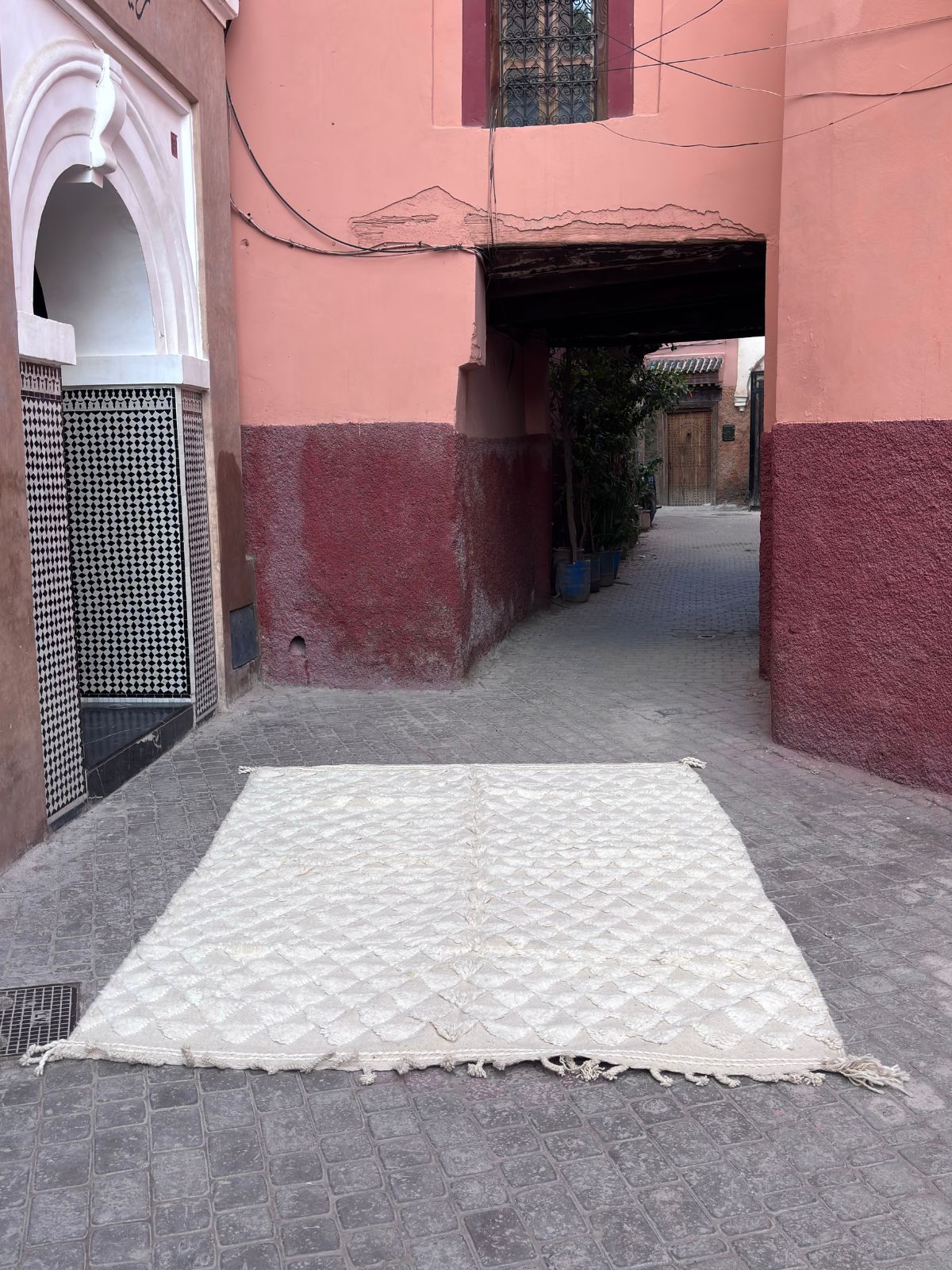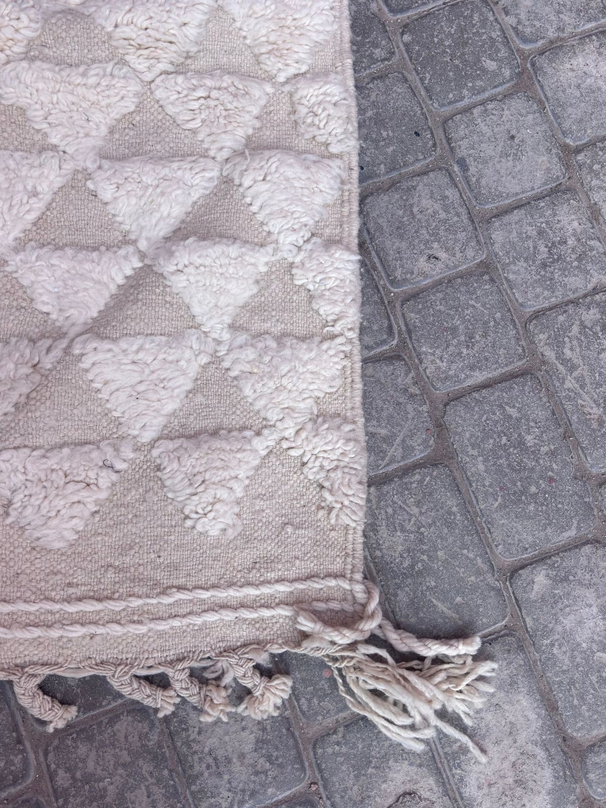 Symbole d’élégance intemporelle, le tapis Beni Ouarain séduit par ses motifs géométriques tracés sur une laine écrue épaisse et moelleuse. Tissé à la main par les femmes de la tribu Beni Ouarine , ce tapis transforme chaque pièce en un espace chaleureux, raffiné et profondément ancré dans l’artisanat marocain.